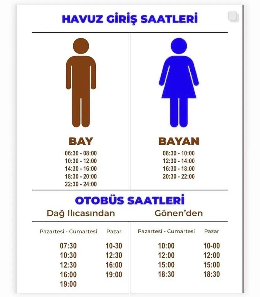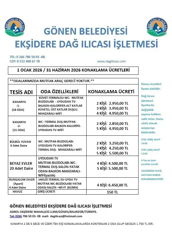 Gönen Belediyesi Ekşidere Dağ Ilıcası İşletmemizde 2026 yılına ait havuz giriş saatleri, otobüs sefer saatleri ve konaklama ücretleri belirlenmiştir.